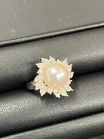 パール プラチナのリングの買取では、真珠のサイズ・照り・傷の有無・巻き厚・形の整い方などが査定のポイントとなります。今回お持ち込みいただいたお品物は、あこや真珠の中でも9ミリという大粒サイズで、希少性が高いことが大きな特徴でした。表面には微細なスレこそ見られたものの、光を柔らかく反射する滑らかな質感が美しく、気品のある輝きを放っていました。照りは中程度ながら、清潔感のある白色系の色味が上品で、プラチナ素材の冷たい輝きと絶妙に調和しています。Pt900は変色や変質が起こりにくく、長く美しさを保てる素材として人気が高い金属です。これにより、日常使いにもフォーマルな席にも適した高級感あるリングとして再販市場でも安定した需要があります。パールの柔らかさを引き立てるシンプルなデザインと、素材の質感が調和した完成度の高いジュエリーでした。