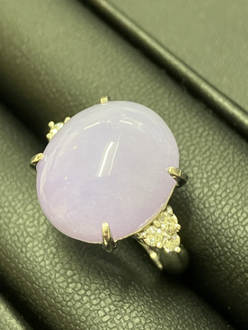 ラベンダー翡翠は、翡翠の中でも淡く柔らかな紫色が特徴的な宝石です。強い発色のものとは異なり、上品で落ち着いた印象を持つため、装いを選ばず身に着けやすい点が魅力とされています。サイズが大きくなるほど存在感が増し、色味の均一さや透明感が価値を左右します。今回のようにプラチナ素材と組み合わせたリングは、宝石の色合いを引き立てるため、中古市場でも一定の需要があります。ラベンダー翡翠製品は流通量が限られているため、状態やバランスの良いものは安定した評価につながりやすい傾向があります。